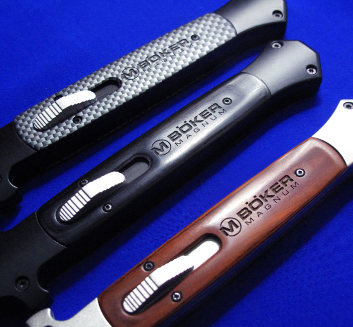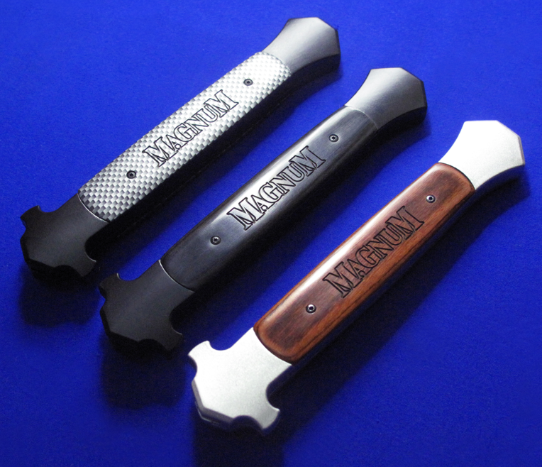BOKER博克马格南 西西里全自动直跳,XXL。 提示:请留意尺寸,这是XXL,比XL还要大。 全长:32.8cm。 刃厚:2.8mm。 刃材:4034。 柄材:T6骨架,实木贴片。 产地:中国代工(博克的马格南系列,产地都是中国)。 提示:低端直跳不要和微技术比,完美主义慎购。