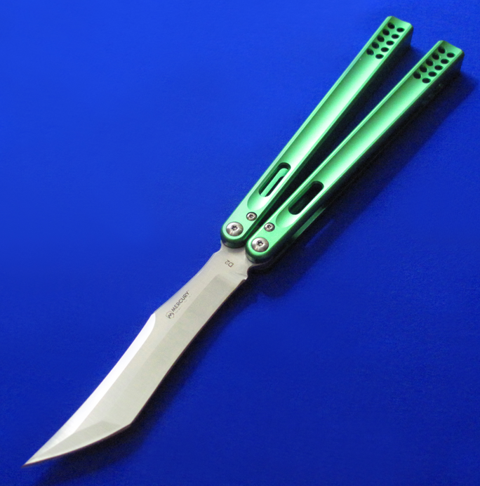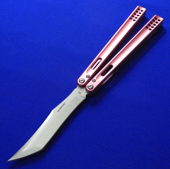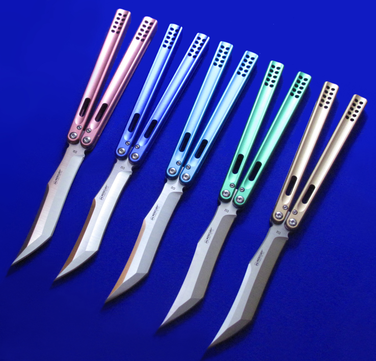 MERCURY平价版甩刀。 强壮一体柄,非三明治结构。 平价版塑料袋包装,非纸盒包装。 颜色左至右:粉、宝石蓝、湖蓝、绿、淡金(土豪金)。 全长:25.3cm。 刃厚:3mm。 刃材:D2。 柄材:T6 6061。 产地:意大利。