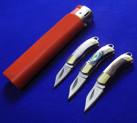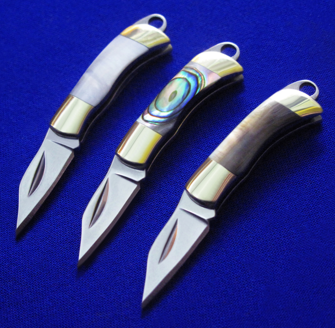 全长5cm,柄材彩蝶贝+黄铜,无锁,刃材不详(估计440或420),日本产。